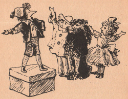© Данько Елена 1941 ![]() Глава первая, о том, как черный пудель покупал бутерброды Жил-был на свете старый шарманщик. Звали его Карло. Жил он один-одинешенек, и не с кем ему было словом перемолвиться. Вот вырезал он себе из полена деревянного мальчика и назвал его своим сыночком Буратино. Буратино бегал, прыгал и баловался, как настоящий мальчишка. Стало у шарманщика с тех пор хлопот полон рот. Но старик не жаловался: уж очень он полюбил своего сыночка. В том же городе жил богатый-пребогатый синьор Карабас Барабас Огромная Борода — хозяин кукольного театра. Он был злой и страшный. Он хлестал своих кукол плеткой и грозил оторвать им головы. Это было в Тарабарской стране, где богачи делают все, что им вздумается, и никто им не смеет перечить. Бедные куклы терпеть не могли своего хозяина. И вот лучшие актеры убежали из его театра. Сначала убежала девочка Мальвина с пуделем Артемоном, а потом убежал мальчик Пьеро. Карабас погнался за ними, пустив по следу свирепых бульдогов. Но старый шарманщик Карло приютил беглецов в своей каморке. А его сынок, веселый Буратино, открыл золотым ключиком потайную дверцу и увел кукол от преследователей. За дверцей оказался чудесный маленький театр. Куклы стали представлять в нем забавные комедии и волшебные сказки. И зажили с тех пор весело и счастливо у старого Карло. А Карабас остался без актеров. Пришлось ему закрыть свой театр. Он злился, рвал свою длинную бороду и ревел от злости. Об этом обо всем рассказано в книжке Алексея Николаевича Толстого «Золотой ключик, или Приключения Буратино», и все читатели думают, что на том дело и кончилось. Я тоже думал, что ничего больше не приключилось с Карло и с его приемными детьми. Но нечаянно я узнал продолжение сказки. Вот как это было. Я живу в Ленинграде и часто хожу в наш кукольный театр. Как-то раз, на каникулах, я забрался туда раным-ранешенько, чуть ли не за два часа до представления. Пришел — и сам не обрадовался. В театре было пусто, темно и холодно. Окошечко в кассе было похоже на закрытый глаз. Старуха уборщица выгребала в коридоре вчерашний сор. Увидев меня, она принялась ворчать. Куда это меня принесло в такую рань? Неужто мне дома не сидится? Я ответил, что боялся опоздать на представление. — Ну, ступай, посиди в буфете. Нечего тут слоняться, сор ногами разносить! — сказала она и стукнула метлой о железный совок. Я пошел в буфет и уселся в уголке. Сонная буфетчица за прилавком вытирала стаканы. Против меня в стене была маленькая дверца с большой надписью: «Посторонним вход воспрещается». Я прочел эту надпись слева направо и справа налево, и мне стало очень скучно. Когда еще начнется представление? Вдруг дверца отворилась, и вошел черный пудель. Гордо выпрямив шею, он нес в зубах корзинку для провизии. Он подошел к прилавку и встал на задние лапы, принюхиваясь и приглядываясь к закускам, разложенным под стеклом. Потом он поднял морду и негромко пролаял: — Гав, гав! Я думал, буфетчица рассердится и прогонит собаку. Мне захотелось подманить пуделя к себе, и я уже нащупал в кармане печенье, оставшееся у меня от завтрака... Но буфетчица ничуть не рассердилась. Она словно проснулась, схватила свою серебряную лопаточку и сказала: — Я к вашим услугам! Тогда пудель протянул стриженую лапу в мохнатой манжетке и указал на бутерброды. — Вам с колбасой? И с ветчиной? И с салом? И с сыро